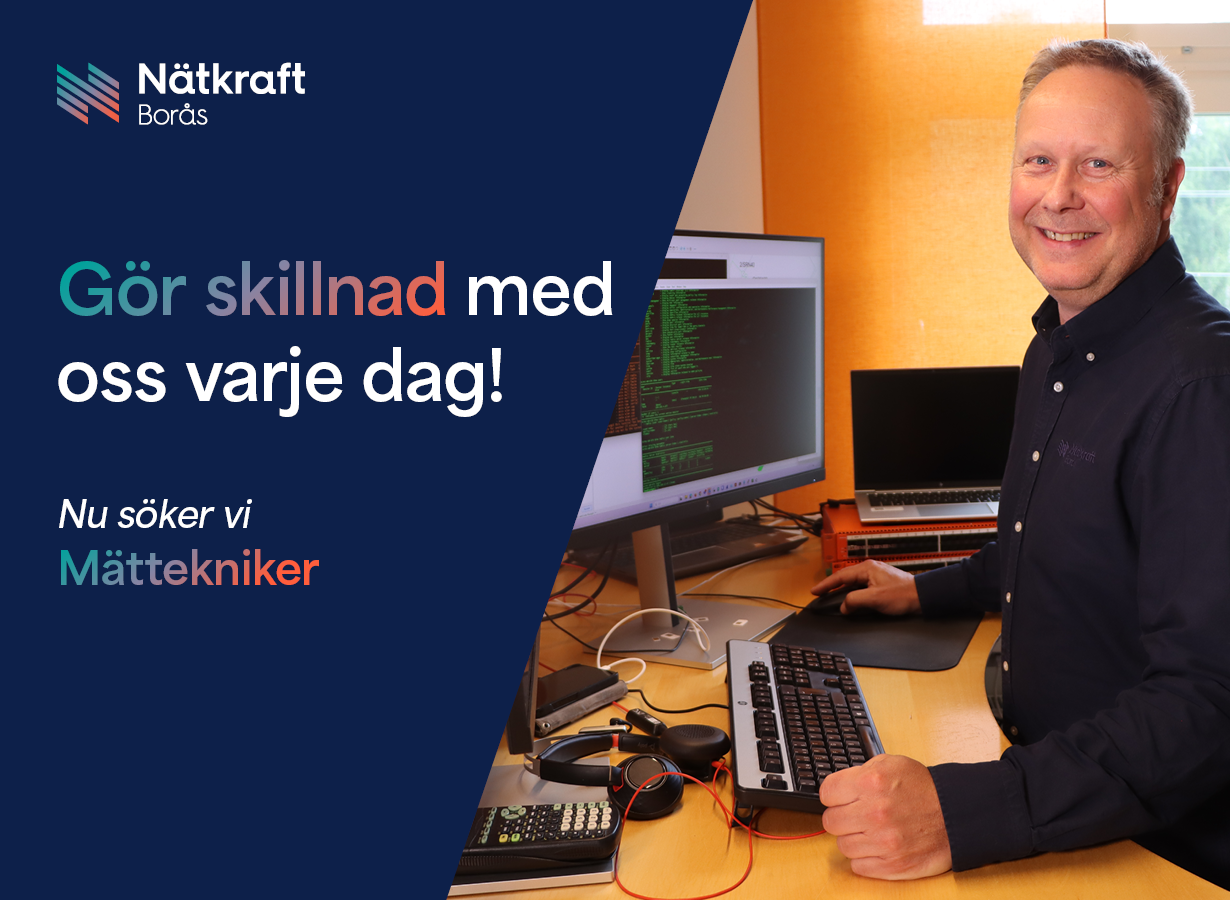 Som mättekniker hos Nätkraft Borås arbetar du med montage, drift och underhåll av mätsystemen där mätinsamling, analys och rapportering är viktiga delar för att fortsätta upprätthålla och förbättra elkvaliteten i elnätet. Det är ett viktigt uppdrag, där korrekt och effektiv hantering av mätdata ligger till grund för våra nätförluster och vår fortsatta utveckling i Borås elnät.